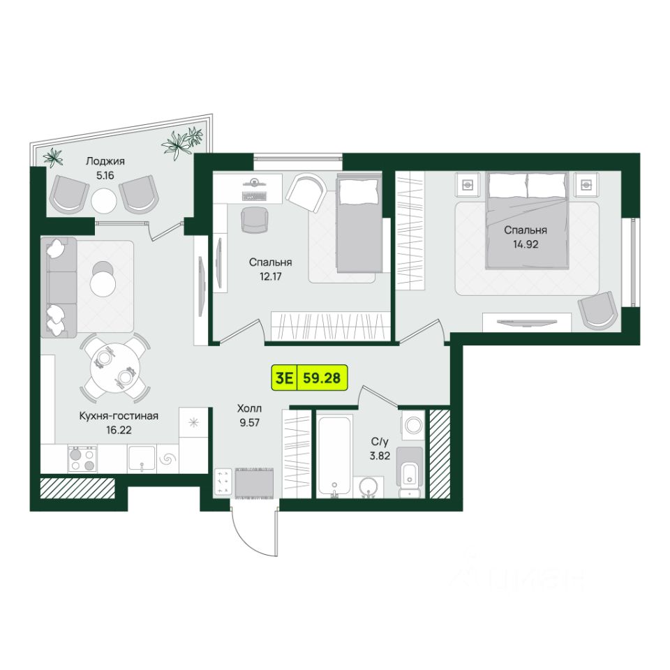 • две отдельные спальни (15.13 м² и 12.36 м²)