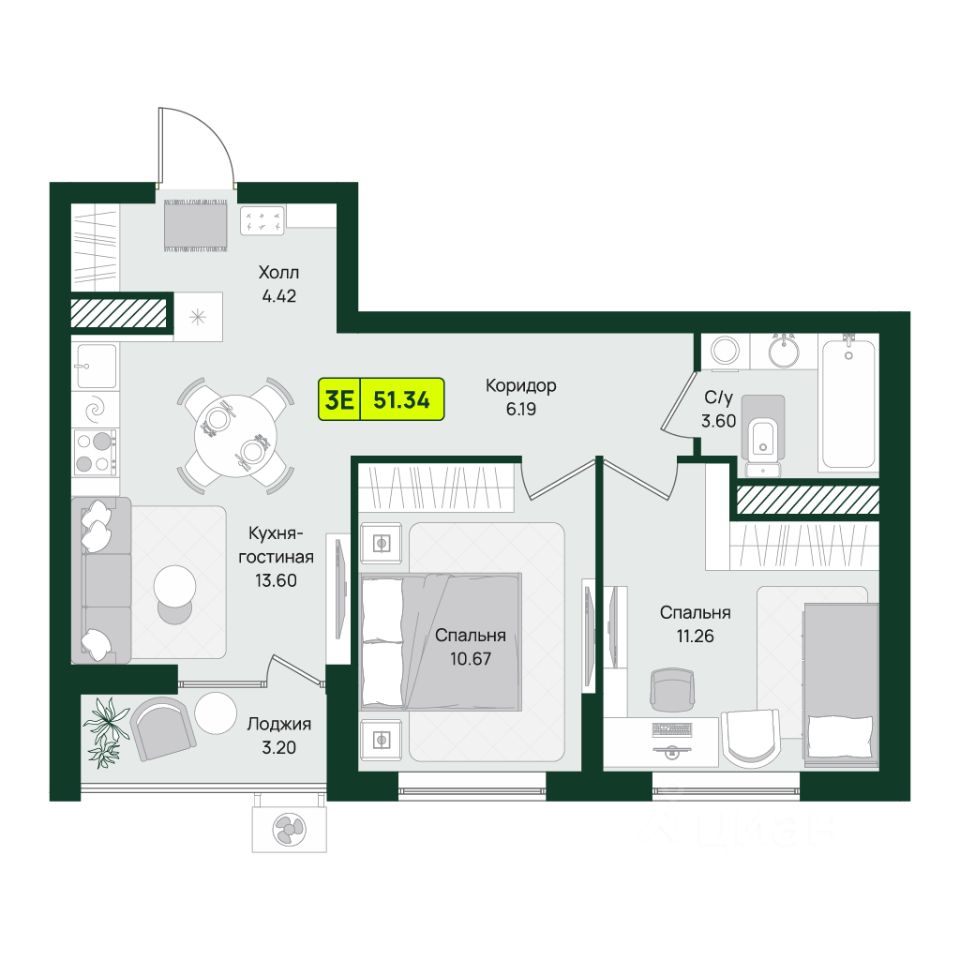 • две отдельные спальни (11.26 м² и 10.67 м²)