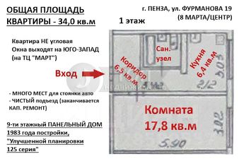 ОБЩ. ПЛОЩ. КВАРТИРЫ: 34,0 кв.м (комната 17,8, кухня 6,4, коридор 6,5, сан. узел совмещенный 3,3).