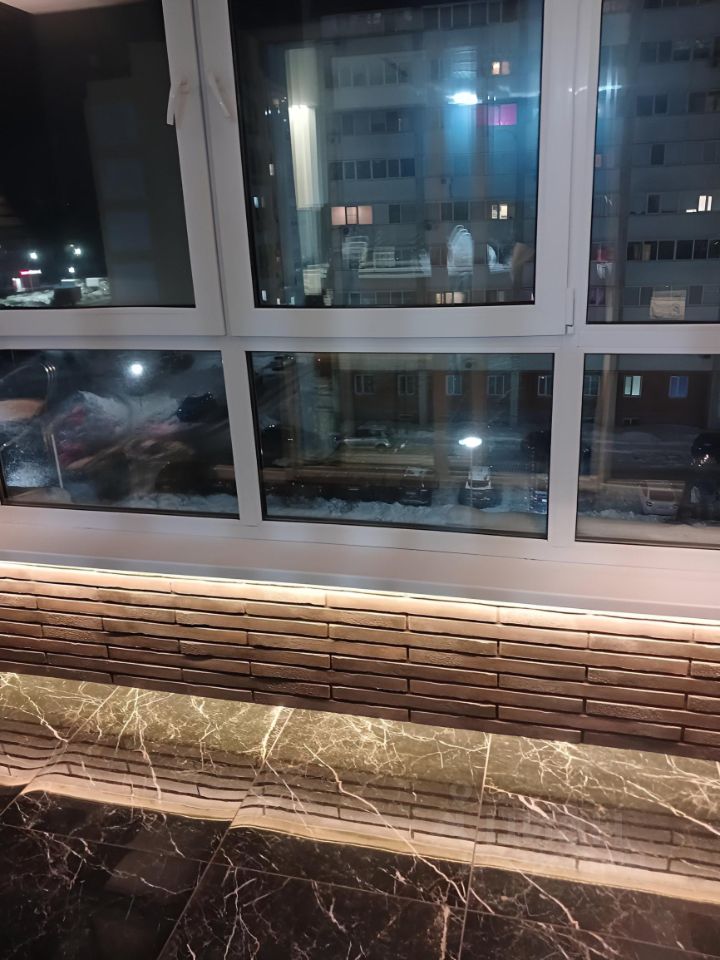 пластиковые окна, дизайнерские решение, такие как стена под камень в зале, освещение по всем стенам, на полу у балкона обогреватель, балкон освещен и обделан в современном стиле, современная сантехника, встроенные шкафы.