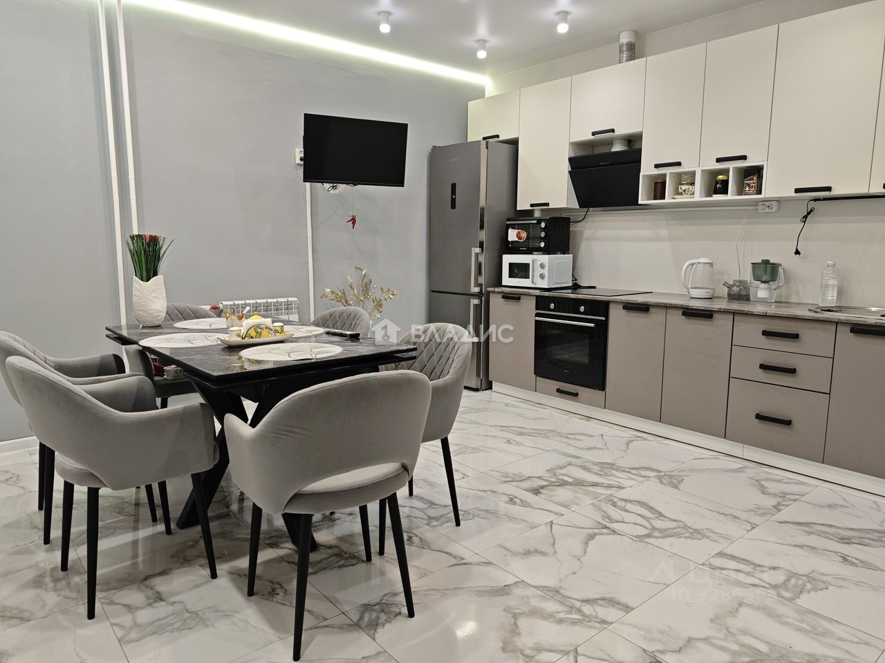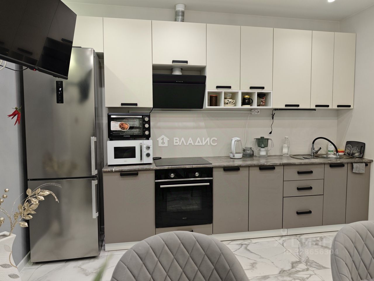 Кухня оборудована функциональным гарнитуром с встроенной техникой: варочная поверхность, духовой шкаф, холодильник, вытяжка, что сделает процесс приготовления пищи максимально удобным и приятным.