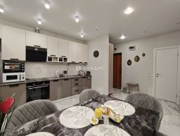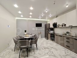 В квартире выполнен качественный ремонт, все элементы подобраны со вкусом в светлых тонах в едином стиле, на полу качественный ламинат, на кухне - керамогранит, натяжные потолки с точечным освещением, санузел в кафеле.