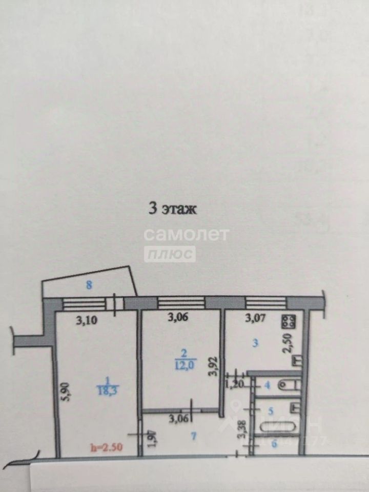 Высота потолков 2.5м.