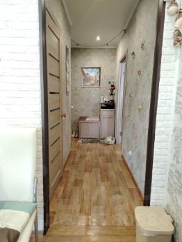 В квартире выполнен хороший ремонт, натяжные потолки во всех помещениях с точечными светильниками и основным светом, санузел в кафеле с угловой акриловой ванной, на полу в комнате, прихожей и кухне качественный прочный линолеум. В коридоре установлен встроенный шкаф для хранения одежды.