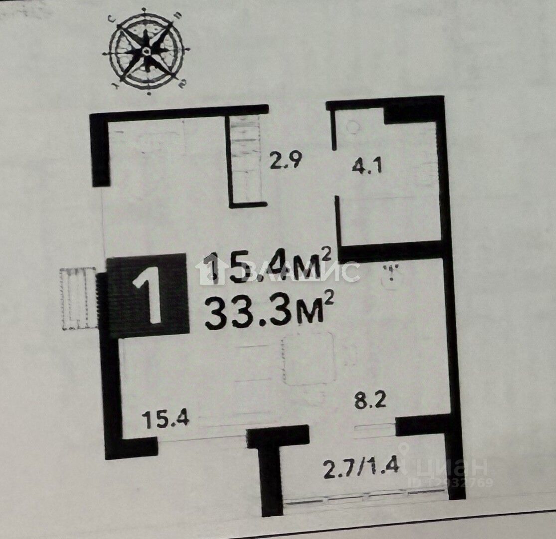 - Общая плoщадь : 33,3 кв. м.