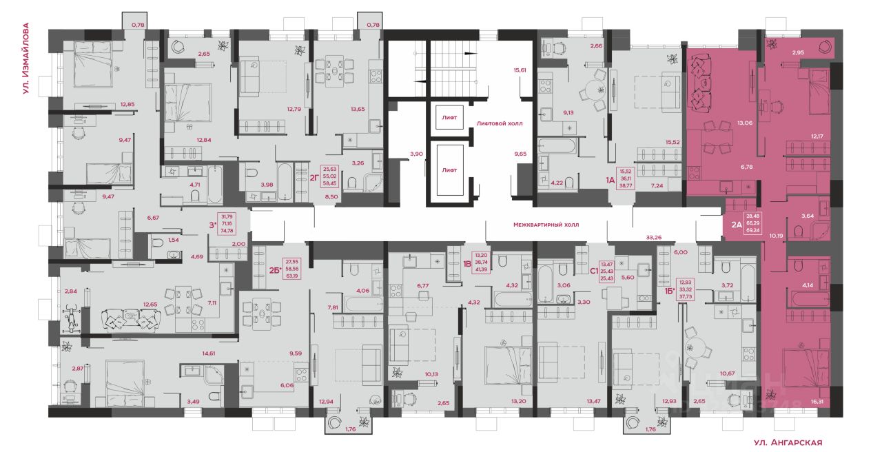 - коллекция квартир от 24,48 до 129,82 м²