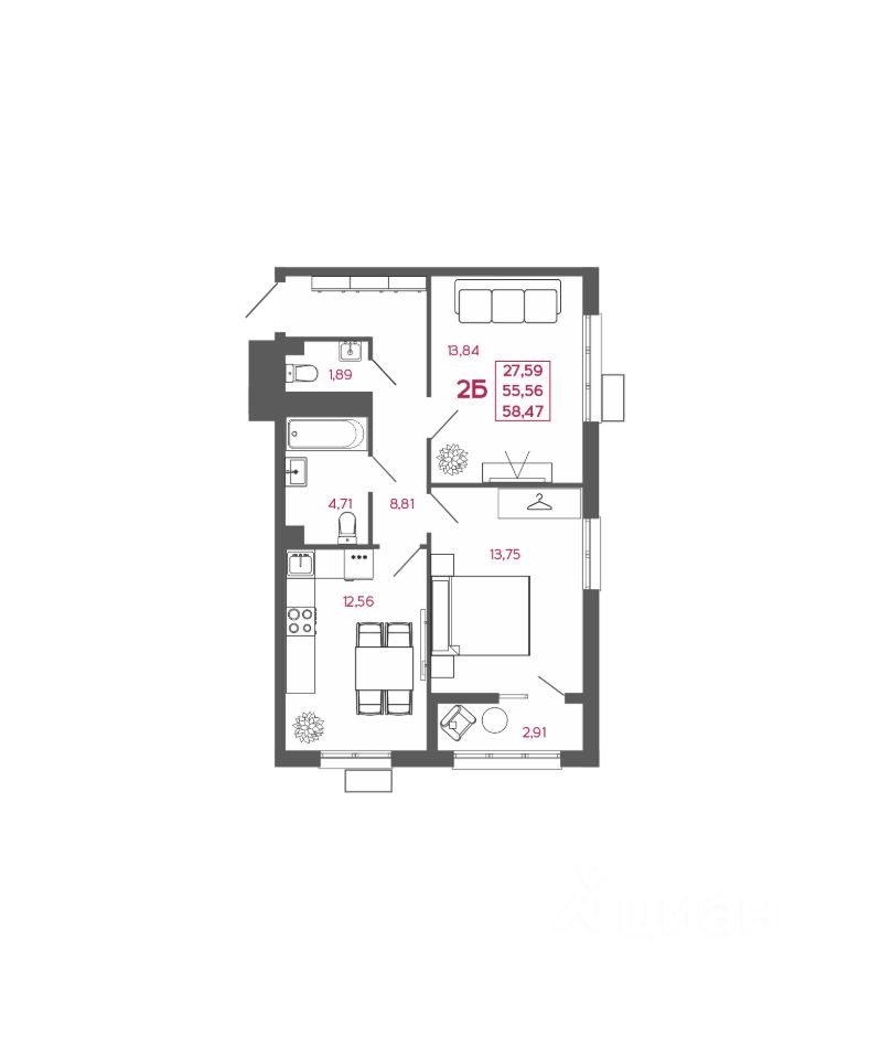 Общая площадь58,47 м²