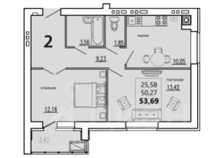 Общая площадь: 53,69 м² (с учётом лоджии)