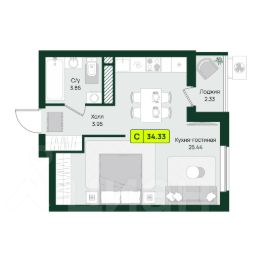 • светлая кухня-гостиная (25.44 м²) для душевных встреч