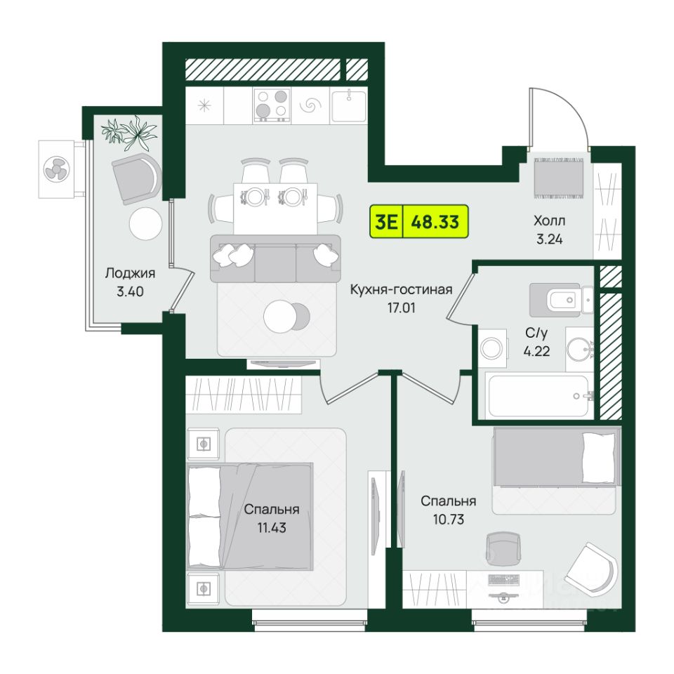 • две отдельные спальни (10.73 м² и 11.43 м²)