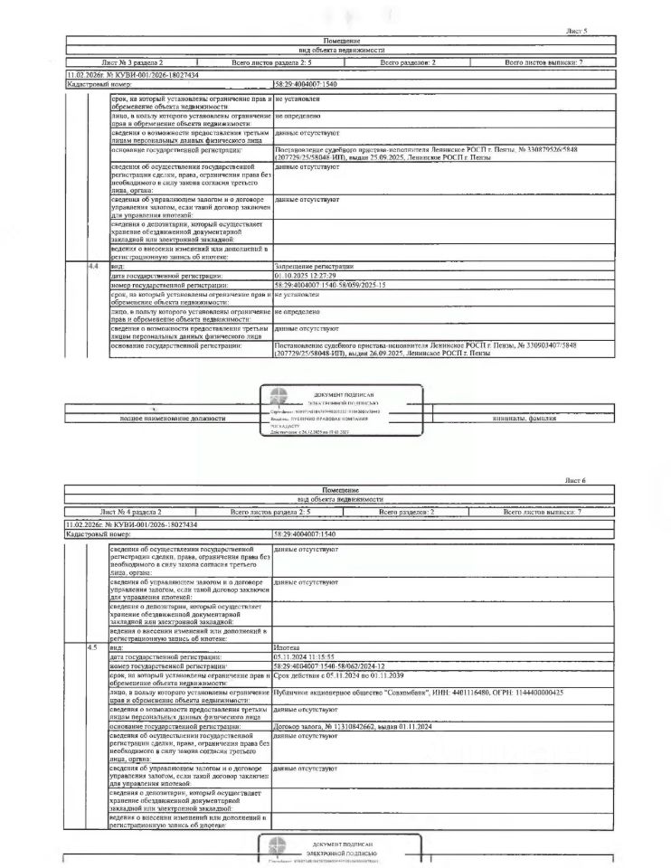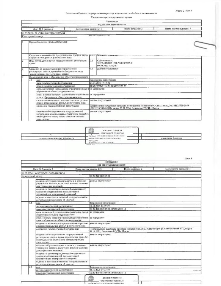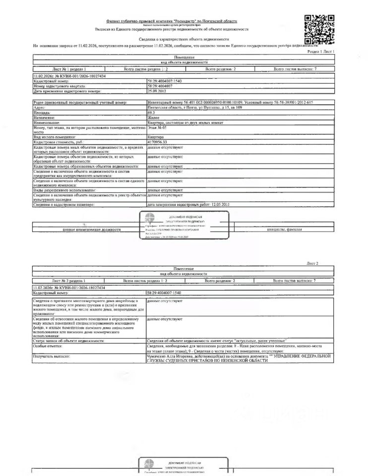 Жилое помещение (квартира) общей площадью 69,3 кв.м., кад. 58:29:4004007:1540, принадлежащее должнику Бояровой Е.С. Зарегистрировано двое граждан, в т.ч. один несовершеннолетний. Сведениями о размере задолженности по коммунальным услугам и взносам на капитальный ремонт, а также о фактическом состоянии объекта недвижимости, организатор торгов не располагает. Ключи, техническая документация и фотографии объекта отсутствуют у организатора торгов.