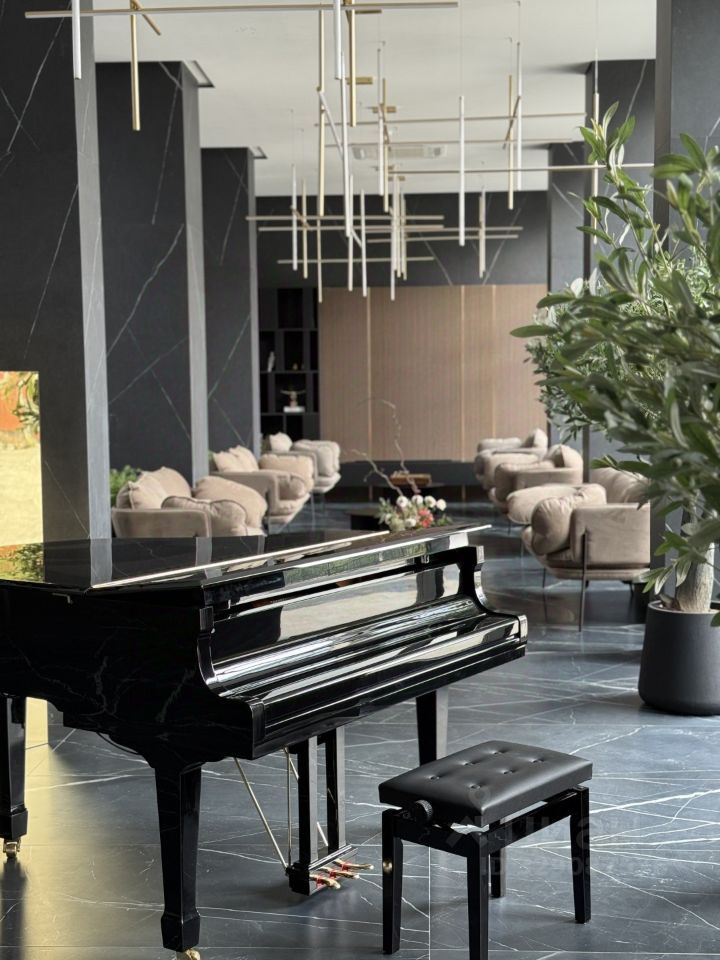 Тут не подъезд, а полноценное лобби на 700 м² — с мягкими креслами, роялем и атмосферой дорогого отеля.