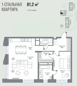81,1 м² | 5 этаж | 1 мастер- спальня со своим гардеробом 5 кв.м и ванной с окном 6.2 кв.м+ кухня -гостиная