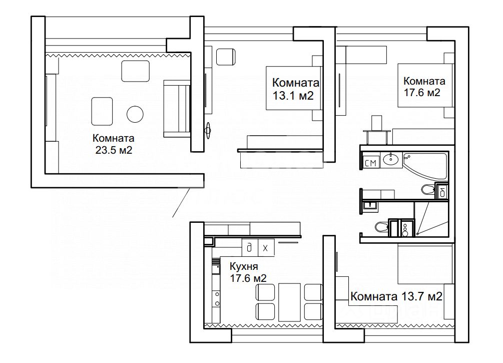 В квартире предусмотрено два полноценных санузла, что очень удобно для большой семьи. Также имеются две кладовые, которые помогут организовать хранение вещей.