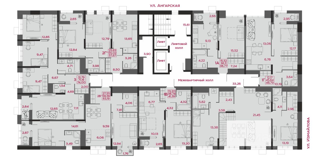 - коллекция квартир от 24,48 до 129,82 м²