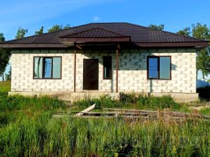 Дом готов из пеноблока (стены на 300 мм) без отделки, 1 этажный (кухня-гостиная, три спальни, сан. узел, коридор, котельная), общая площадь 100 кв.м.