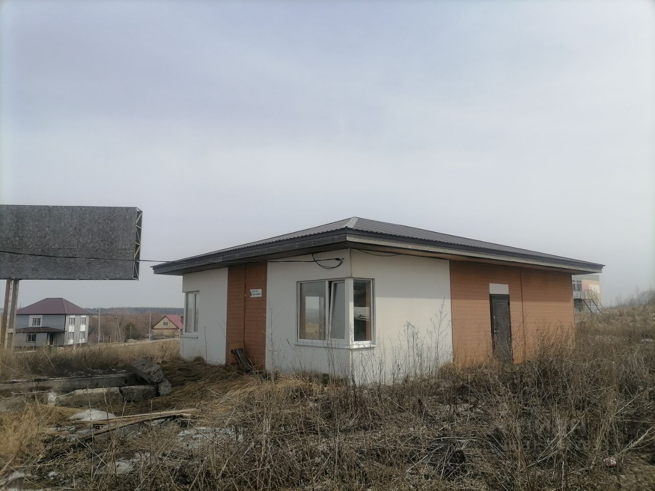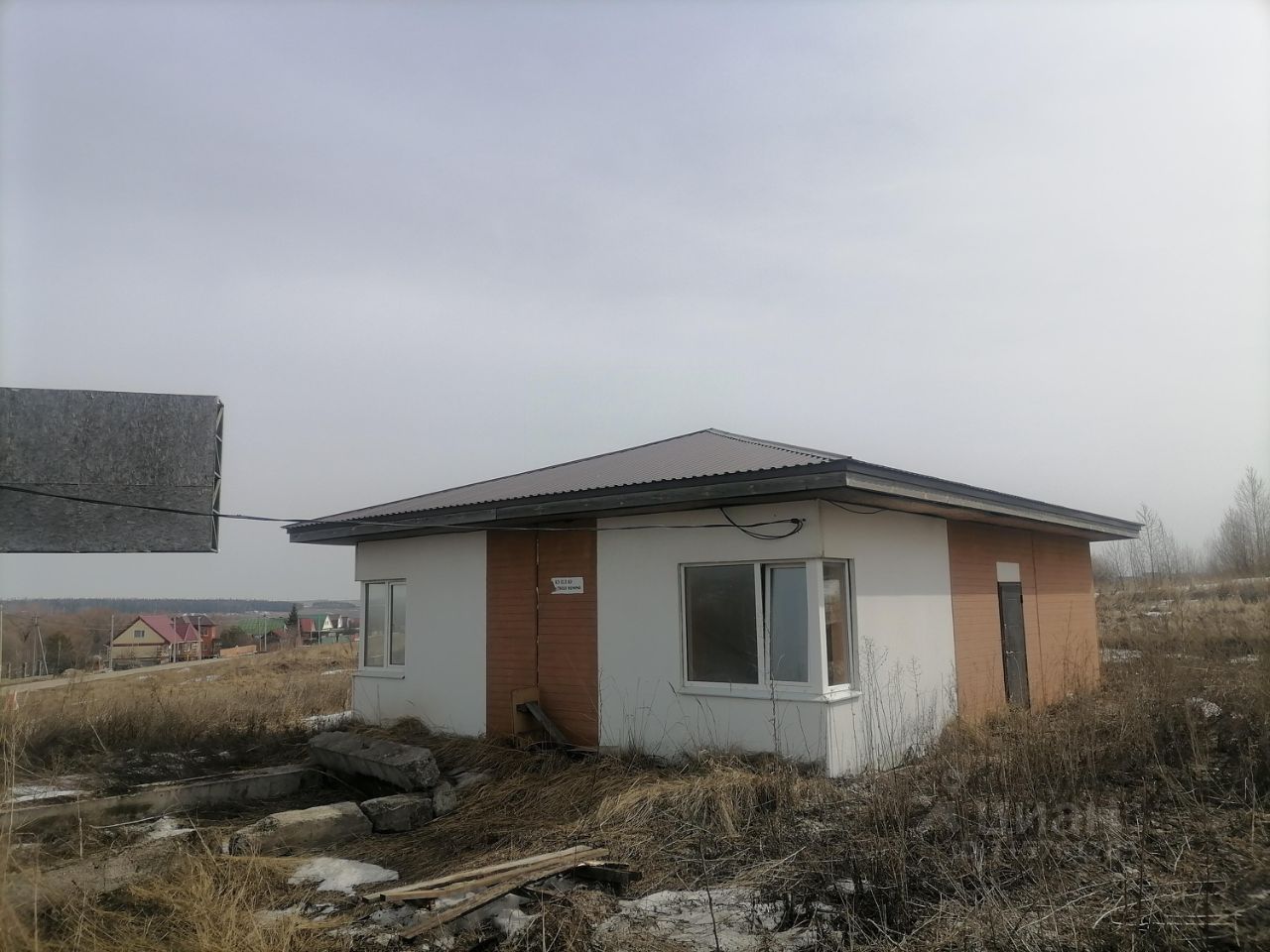 Дом изготовлен из утепленных стеновых панелей, сделана частичная отделка (оштукатурены и окрашены стены, пол облицован керамогранитом), требуется косметический ремонт.