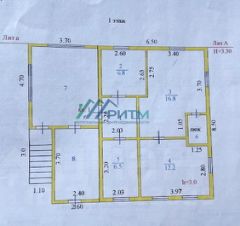 Первый этаж представлен большой крытой верандой (9 м2), жилыми комнатами (16,8, 12,5, 7 и 6,5 м2), прихожей.