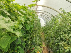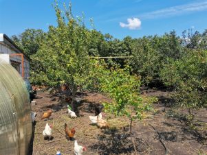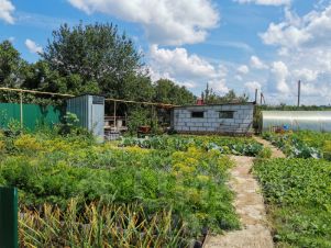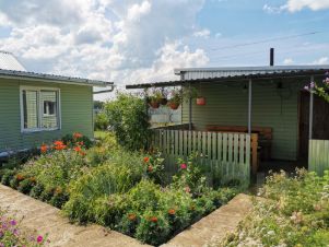 кроме жилой зоны имеется летняя веранда, банный комплекс (баня с сауной 25 кв.м., зона для бассейна и летный душ), сад-огород с разнообразными плодовыми деревьями (яблони, груши, сливы) и ягодными кустарниками (ежевика, малина, смородина, крыжовник, жимолость), большая теплица (10х3). Хозяйственная зона: гараж (12х4) и летняя кухня с водопроводом и погребом, курятник (из пеноблоков 25 кв. м.), дровник с запасами.