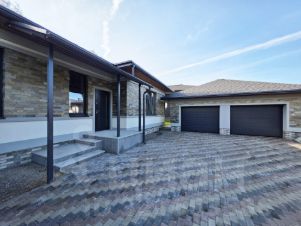 - возведен из красного кирпича (Римкер М150), комбинированная отделка фасада (натуральный камень /фасадная штукатурка), утепление базальтовая (каменная) вата;