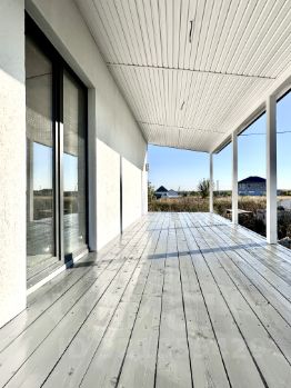 Приятная особенность дома просторная открытая терраса площадью 27 квадратных метров, оформленная современным профнастилом и ухоженными крашеными деревянными полами.