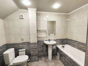 Первый этаж — кухня гостиная 30 кв. М., зал с камином 24 кв. М., котельная-подсобная комната, санузел, гараж (автоматические секционные ворота с ДУ).