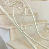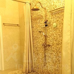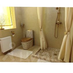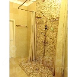Все полы, подоконники, стены в санузлах обложены натуральным камнем травертин, что придаёт особый благородный вид помещениям, поскольку рисунок на натуральном камне со временем становится выразительнее.