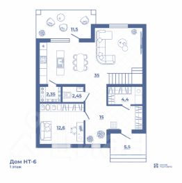 Главная особенность кухни-гостиной — планировка "второй свет": потолок здесь не имеет перегородки и тем самым объединяет два этажа, наполняя помещение светом и воздухом. Это решение визуально увеличивает пространство.