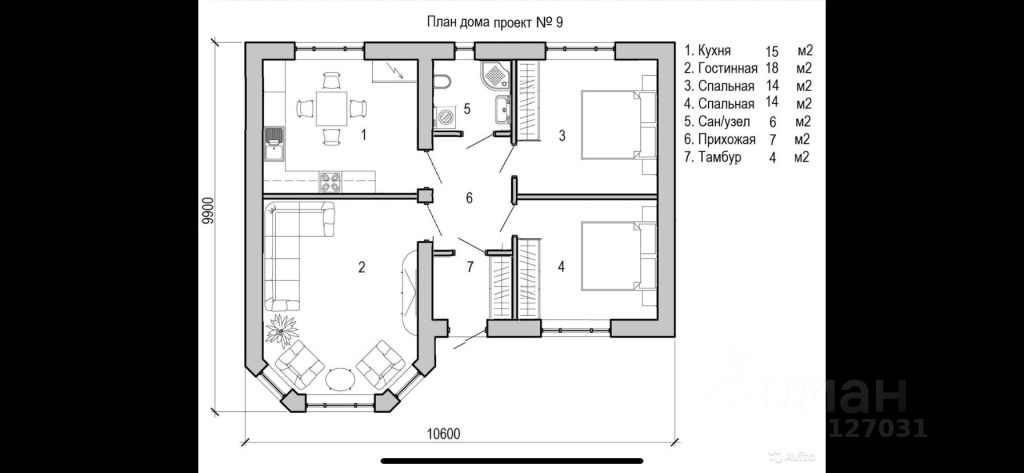 Просторная кухня-гостиная с выходом на двор, 2 спальни, совмещенный санузел.