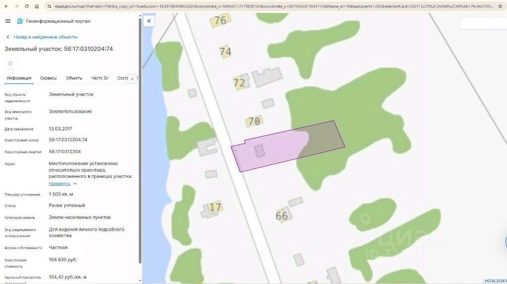 Земельный участок, категория земель Земельный участок для ведения личного подсобного хозяйства, кадастровый (условный) номер 58:17:0310204:74, площадь: 1500 кв.м. Вид собственности: Индивидуальная, Местонахождение: Местоположение установлено относительно ориентира, расположенного в границах участка. Почтовый адрес ориентира: Пензенская область, Малосердобинский район, с. Майское, ул. Заречная, дом 68.