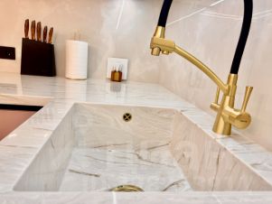 Установлен роскошный кухонный гарнитур со столешницей из искуственного камня и функциональным кухонным островом.