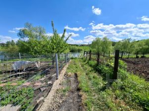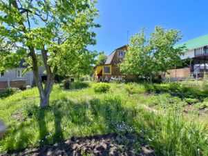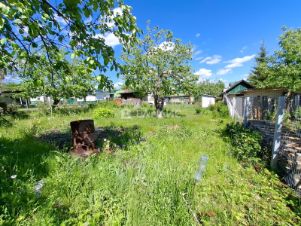 На участке растут плодовые деревья, ягодные грядки, дорожки по саду из бетона.