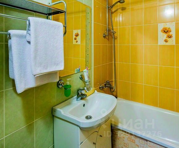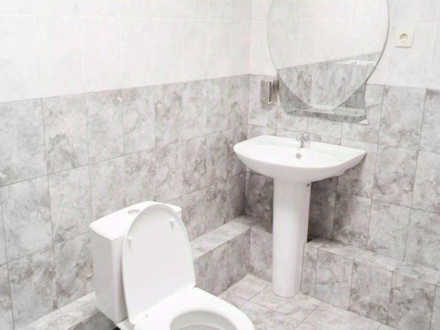 В ванной: туалет, раковина, зеркало, тапочки, душ или ванная, средства личной гигиены.