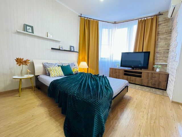 Квартира подойдет для размещения 4 человек. Спальные места: двуспальная кровать, раскладной двуспальный диван. Есть всё необходимое для комфортного проживания: телевизор, кондиционер, Wi-Fi, стиральная машина, водонагреватель, утюг, фен, гладильная доска, журнальный столик. Оборудованная кухня с бытовой техникой: холодильник, варочная панель, микроволновая печь, электрочайник, посуда и столовые приборы. Полотенца, постельное белье, мыло, шампунь, гель для душа предоставляются.